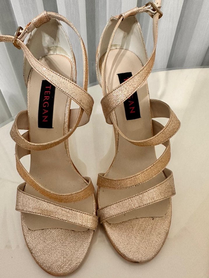 Altın renkli, parlak yılan deseni ve tokalı bantlara sahip stiletto topuklu kadın ayakkabısı. Düğünler için uygun, kauçuk tabanlı.