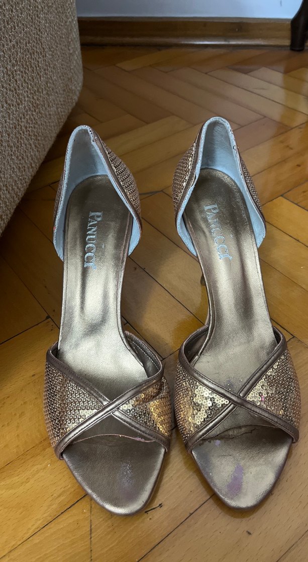 Altın parlak renkte, yılan desenli, tokalı ve lastik malzemeden yapılmış stiletto topuklu ayakkabılar, düğün ve şık etkinlikler için uygun.