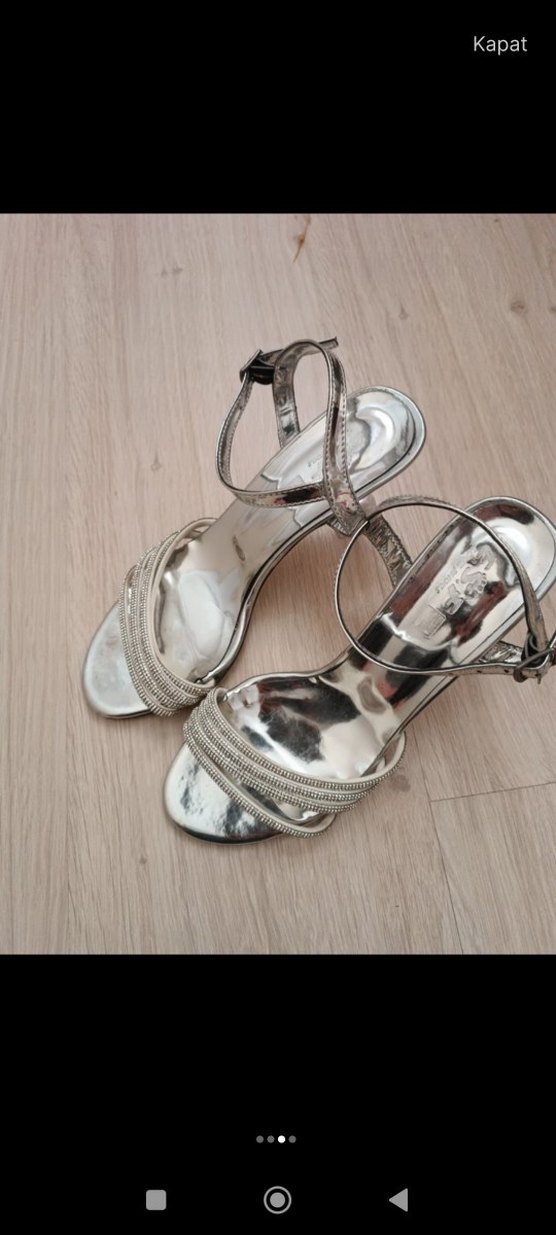 Parlak altın renkli metal malzemeden, yılan desenli stiletto topuklu kadın ayakkabısı. Kemerli ve klasik zarafette, düğünler için uygun.
