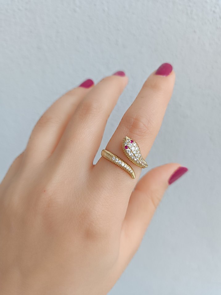 Altın renkli, yılan desenli ve taşlı kadın yüzük. Çağdaş tarzda, cesur görünümler ve düğünler için uygundur. ✨