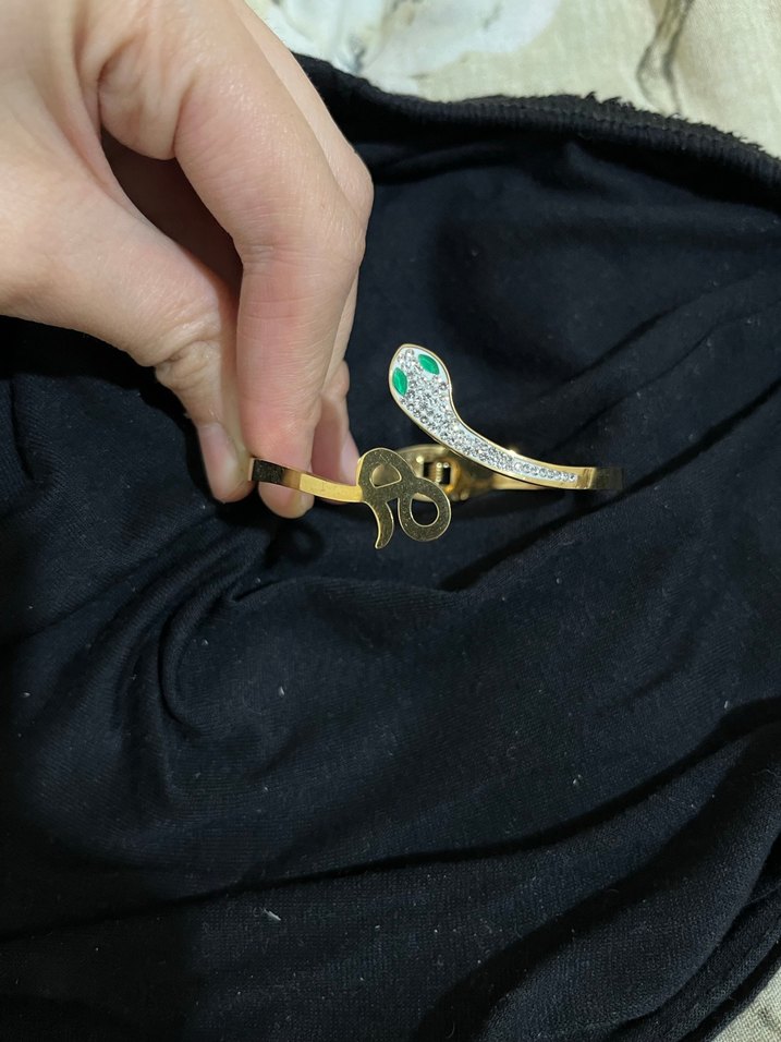 Parlak yılan deseni ve tokalı kapamasıyla altın renkli bilezik, günlük sokak stiline uygun minimal tasarım.