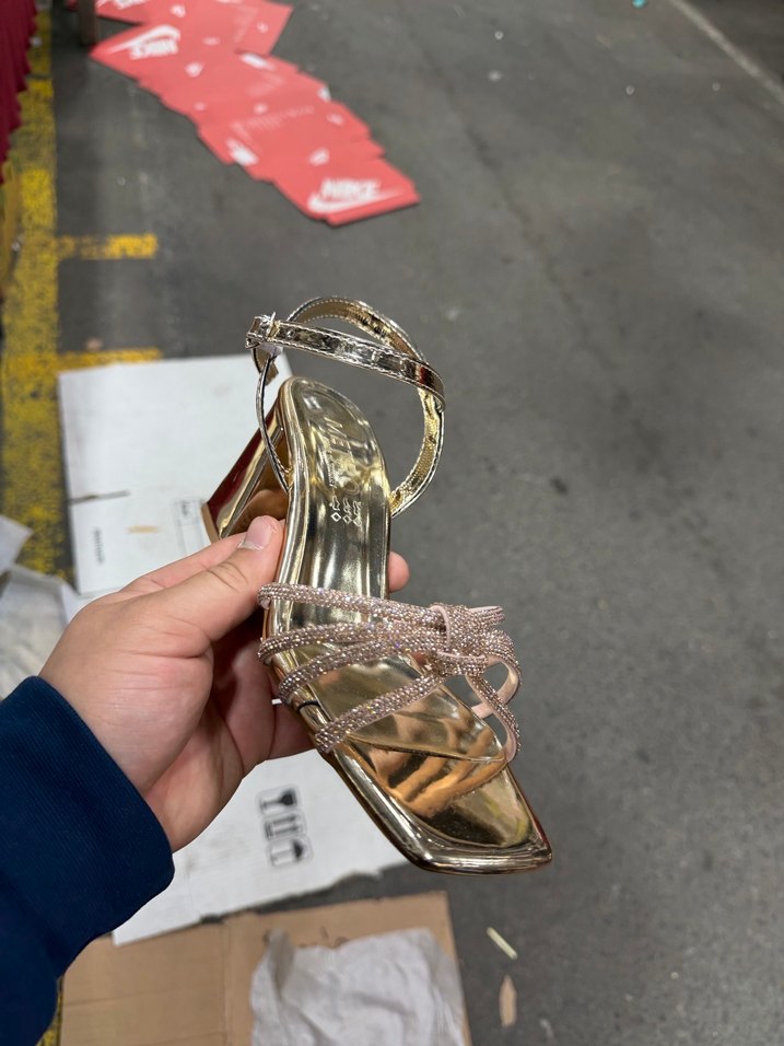Parlak altın renkli, yılan desenli, tokalı bantlı yüksek topuklu ayakkabı, klasik zarafet ve modern tarzı birleştirir, düğünlere uygundur.