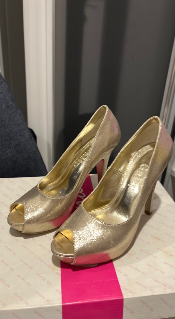 Altın renkli, parlak yılan desenli topuklu kadın ayakkabısı. Tokalı detaylı, modern klasik tarzda, düğün ve özel günlere uygun.