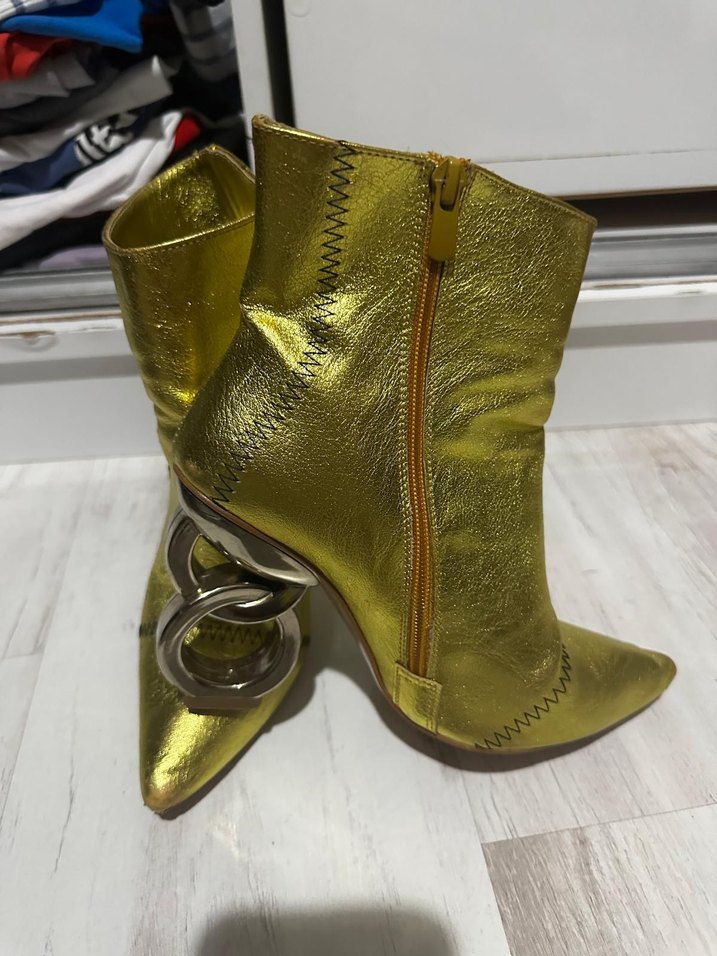 Parlak altın renkli deri, yılan deseni ve zincir detaylı topuklu kadın bot. Yan fermuar ve tokalı, romantik akşamlar için ideal.