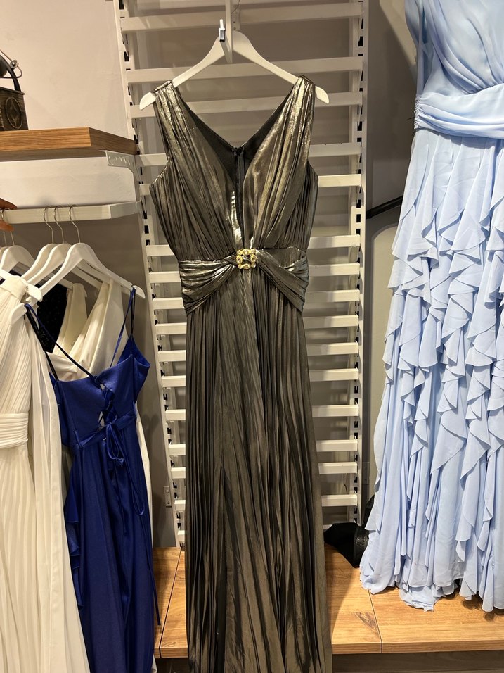 Altın renkli yılan desenli, pileli kumaştan uzun abiye elbise. V yaka, ince askılı ve regular kesim, parti için uygundur. ✨