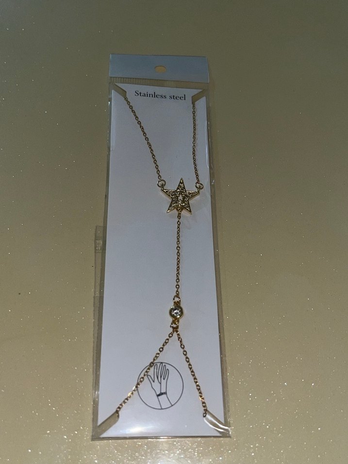Altın renkli, yıldız figürlü ve detaylı zincir yapısına sahip kadın el zinciri, günlük kullanıma uygun minimal ve bohem tarzda. ✨