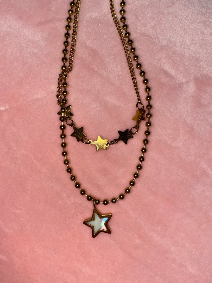 Altın renkli zincir detaylı, işleme yıldız desenli bu kolye gotik ve grunge punk tarzını yansıtır. Normal midi uzunluğunda, katmanlı yıldız figürlü bir tasarıma sahiptir. Ürün paslanmaz çeliktir