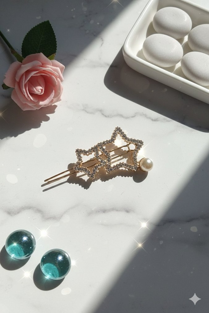 Altın renkli metal saç tokası, payetli yıldız figürü ve inci detayıyla modern klasik ve gösterişli şıklık sunar. ✨