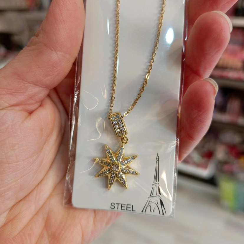 Zincir detaylı, yıldız şeklinde taşlı kolye. Çelik malzemeden üretilmiş, günlük kullanıma uygun modern klasik tasarım. ✨