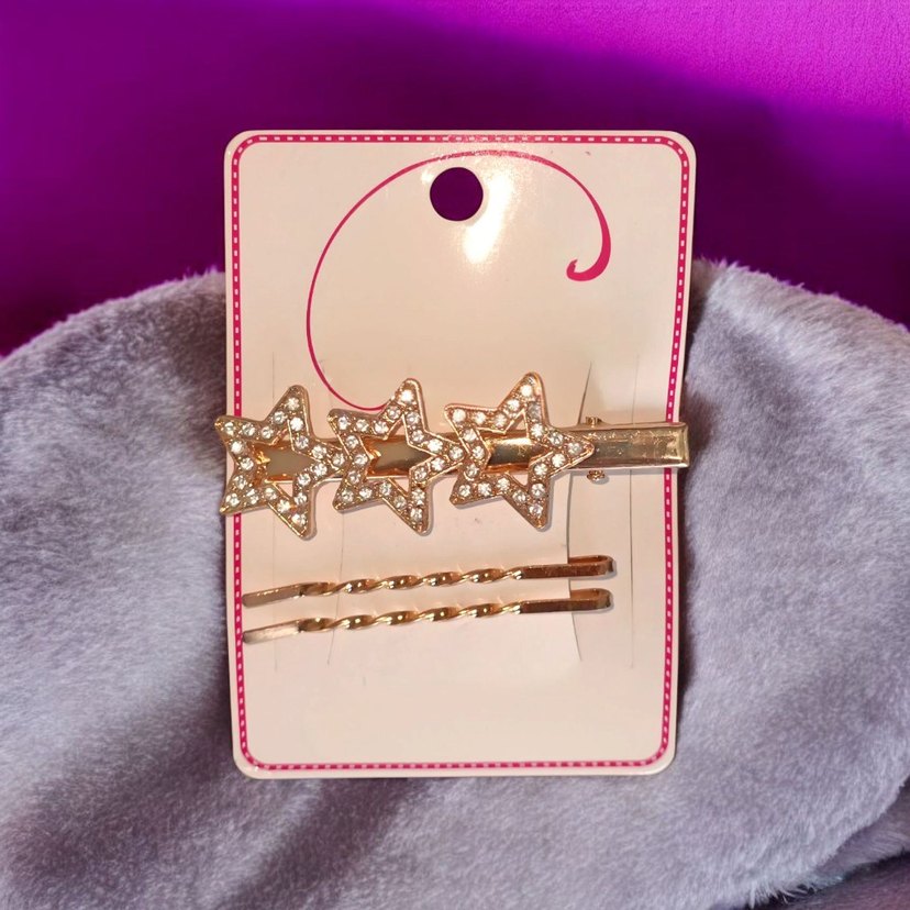 TEKLİF KABUL EDİLMEYECEK Ipeksi dokulu, altın renkli, üç sıralı payetli yıldız tokası ve iki sade burgu saç tokası seti, ışıltılı bir görünüm sağlar. ✨