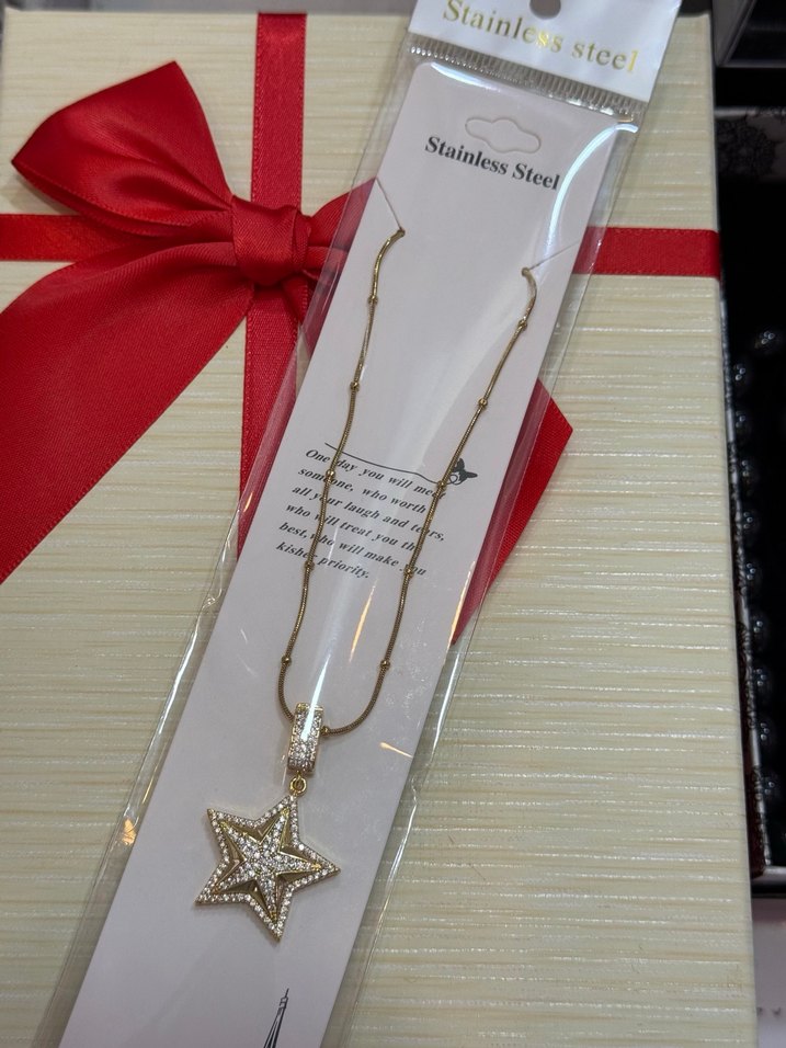Paslanmaz çelikten, parlak altın renkli, yıldız uçlu midi uzunlukta, çağdaş Paris tarzında kolye. ✨