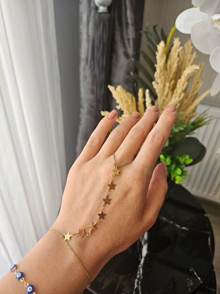 İşlemeli yıldız şeklinde boncuklarla süslenmiş, minimalist bohem tarzında altın renkli el zinciri. ✨