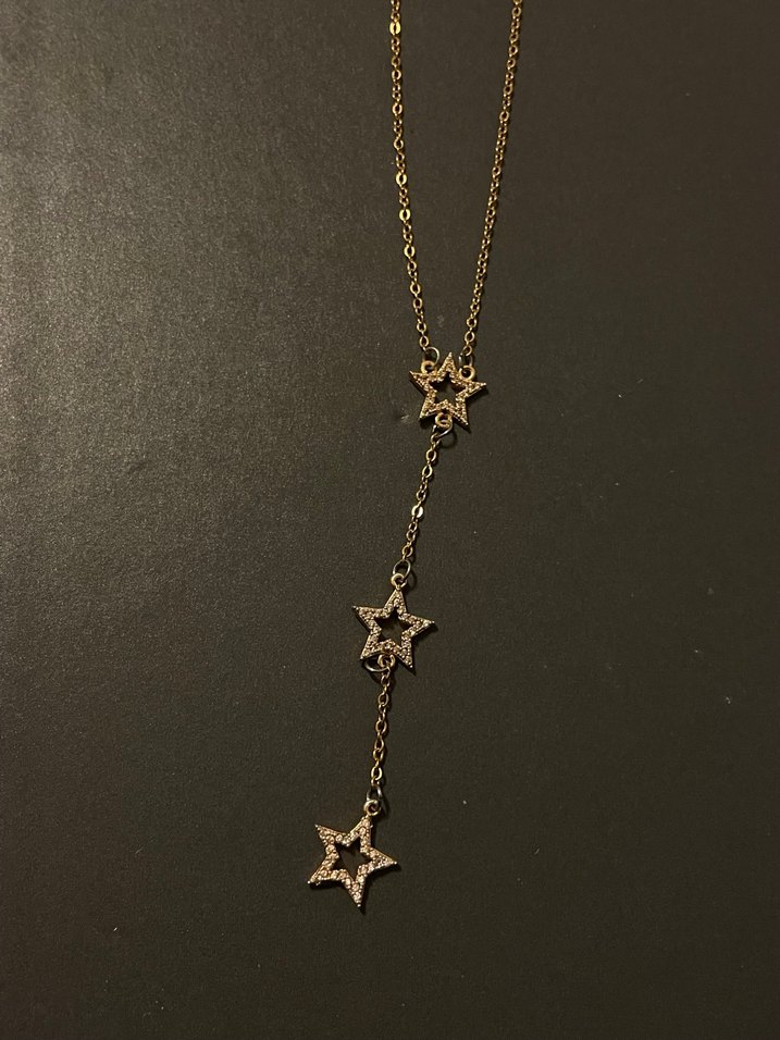 Altın renginde, zincir detaylı ve üç yıldız figürlü, bohem tarzda midi uzunlukta kolye. Romantik akşamlar için uygun. ✨