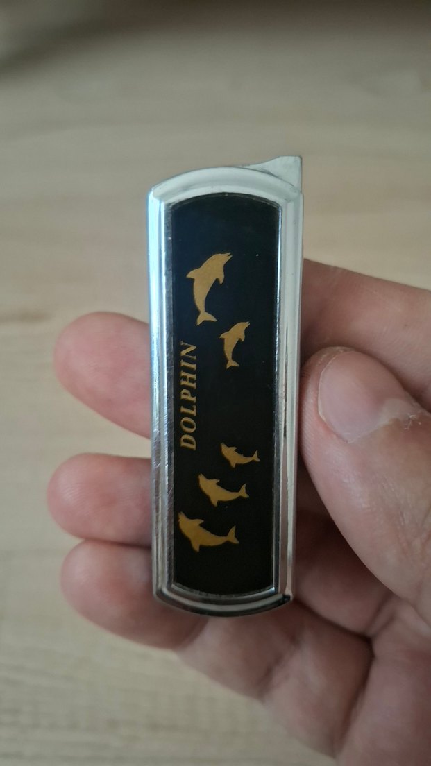 Altın renginde, üzerinde yunus figürleri ve 'DOLPHIN' yazısı bulunan koyu renkli çakmak.