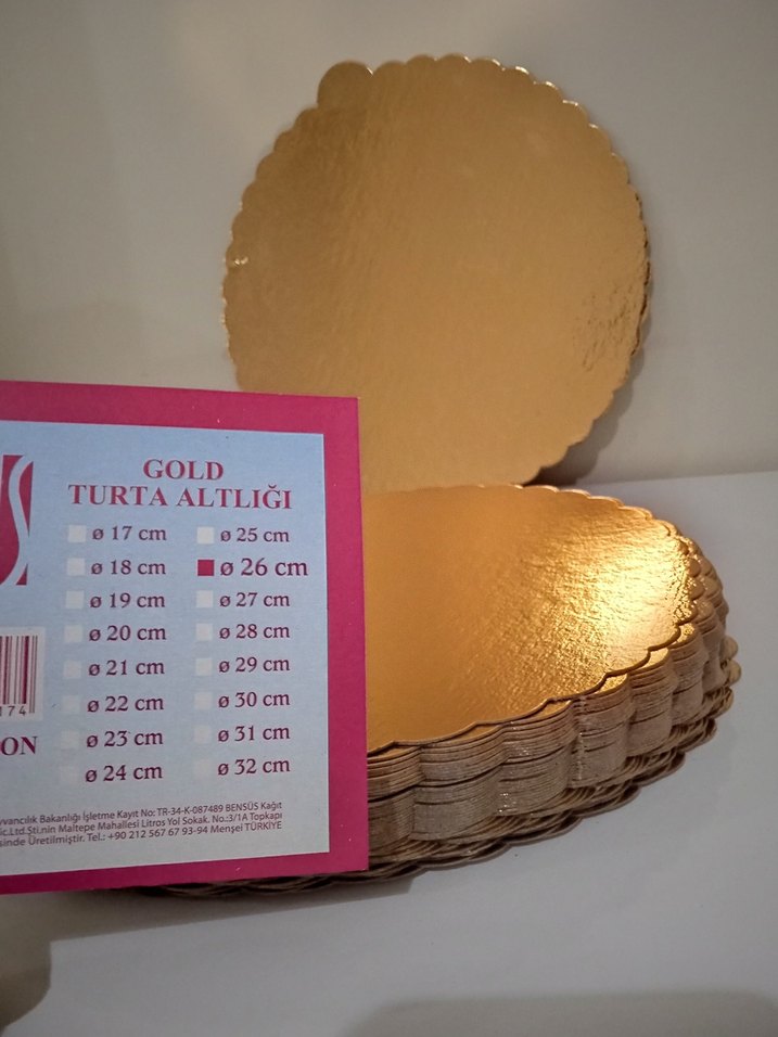 26cm çapında, altın renkli yuvarlak pasta altlıkları. 10 adet fiyatıdır hiç kullanılmadı