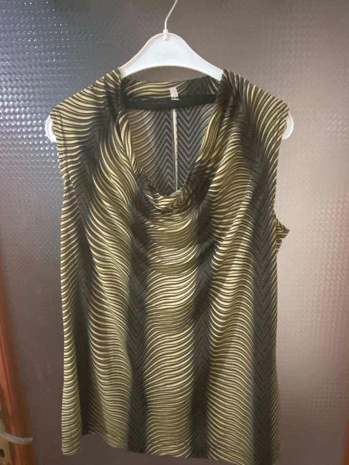 Yüksek yakalı, kolsuz, parlak altın zebra desenli, pilili ve bol kesim midi uzunluğunda kadın bluz. Teklif attığınız fiyata satacağım