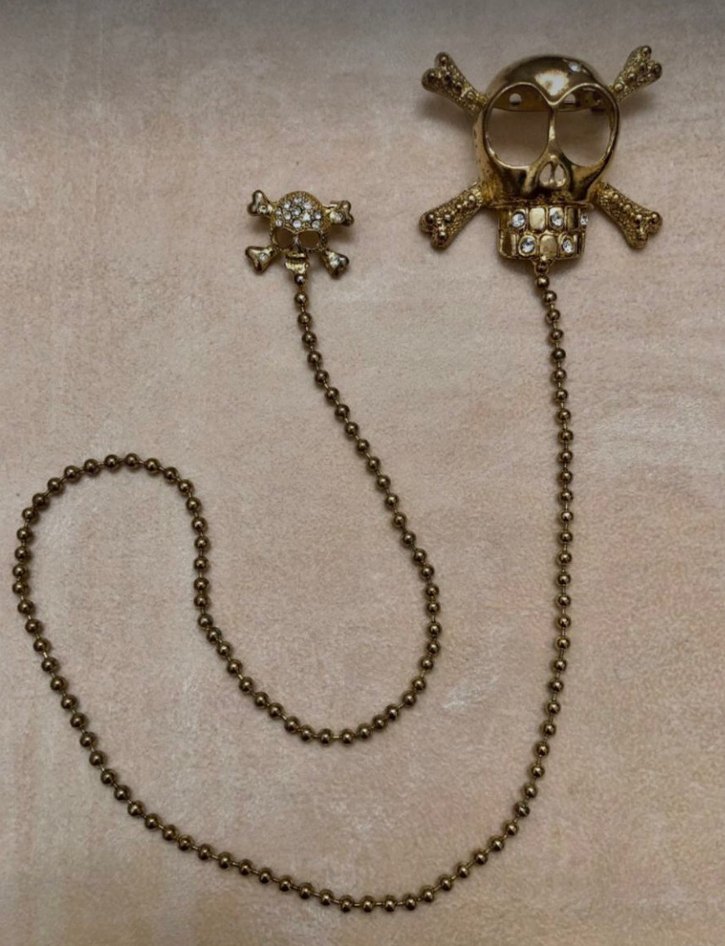 Altın renkli, detaylı kafatası tasarımlı ve parlak yüzeyli kıyafet aksesuar zinciri. Vintage ve gotik tarzlar için kullanılabilir.