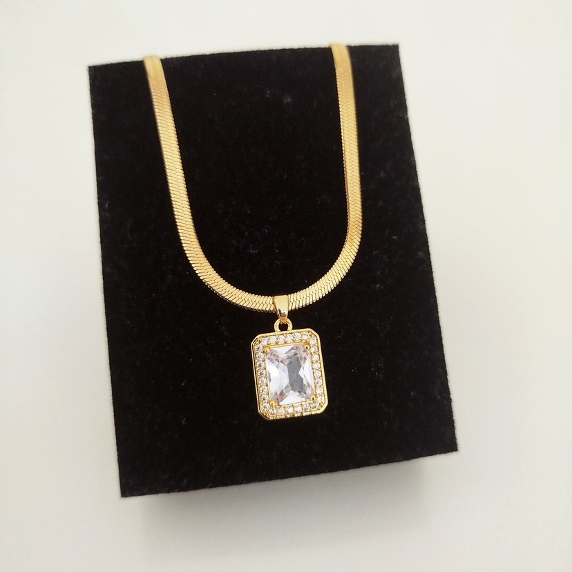 Parlak altın renkli zincir detaylı midi uzunlukta, dikdörtgen taşlı kolye. Günlük kullanıma uygun, şık ve gösterişli.