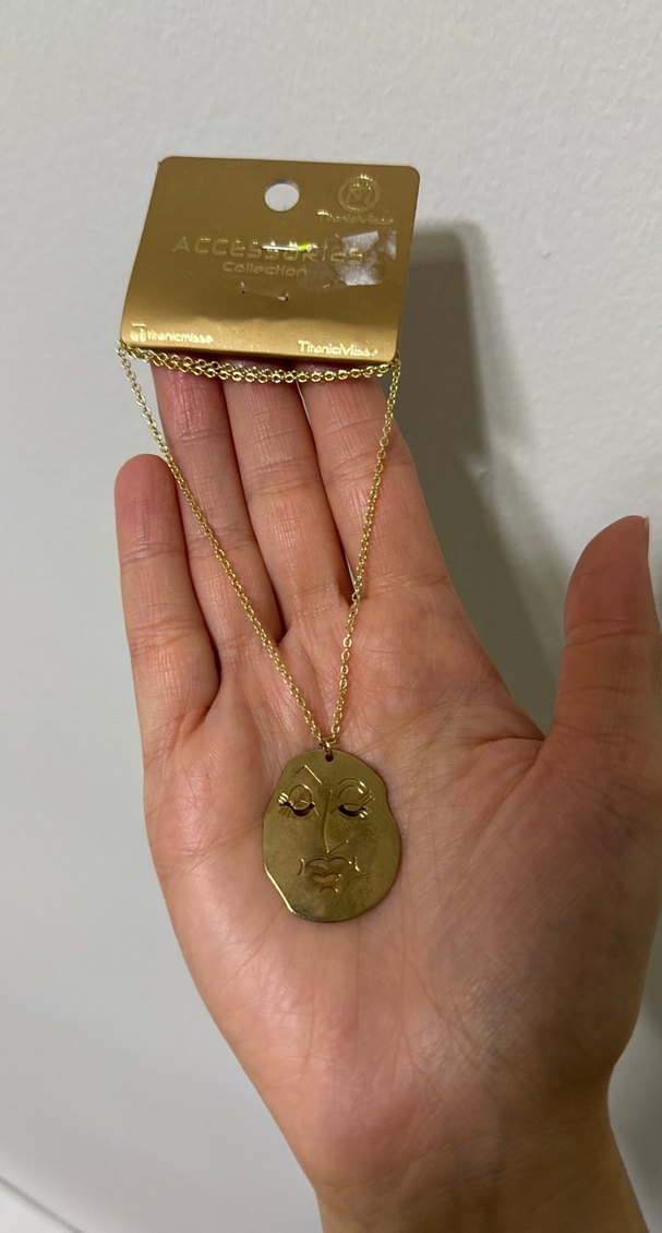 Altın renkli, zincir detaylı bohem kolye. Parlak ve üzerinde soyut yüz deseni bulunan baskılı bir madalyon ile midi uzunluğunda, günlük kullanıma uygun.