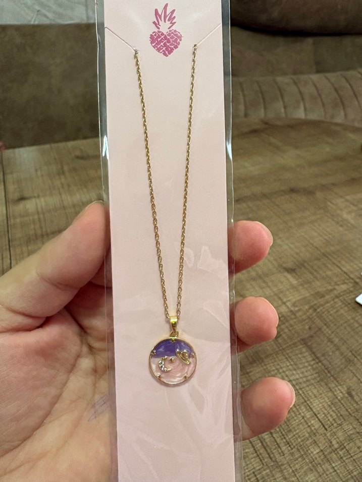 Altın renkli zincir detaylı, pastel baskılı kolye. Normal midi uzunluğunda, bohem, hippie ve retro tarzlara uygun, günlük kullanıma ideal.