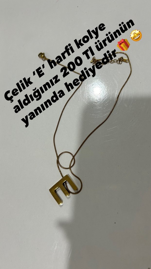 Parlak altın renkli, zincir detaylı midi uzunlukta çağdaş bir kolye. Üzerinde 'E' harfi baskısı bulunur. 200 TL üzeri alışverişe hediye