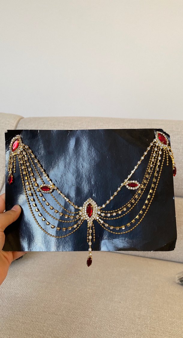 Altın renkli, parlak kırmızı taşlı ve çoklu zincir katmanlarına sahip kadın alın zinciri, düğün ve klasik şıklık için uygundur. ✨