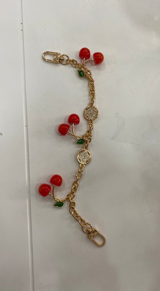 Altın renkli zincir üzerinde canlı kırmızı kiraz ve yeşil yaprak detayları bulunan kadın çanta sapıParis tarzı nostaljik bir hava taşır.