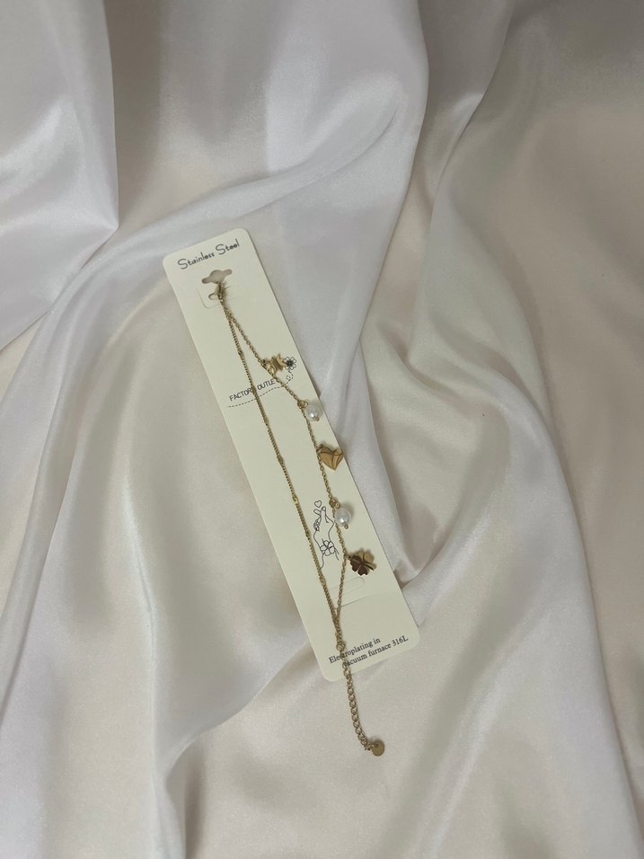 Altın renkli, zincir detaylı ve küçük figürlü kadın el zinciri. Hafif, minimalist bohem tarzda, günlük kullanıma uygun. ✨
