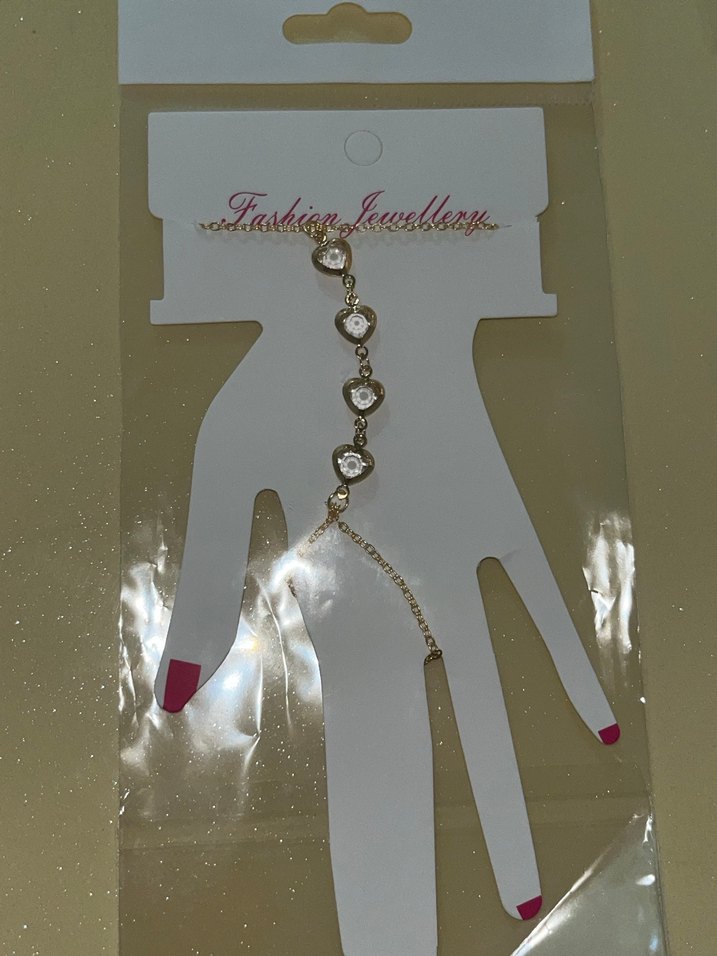Altın renkli, zincir detaylı kadın el zinciri, kalp şeklinde süslemelere sahip, düğünlerde bohem ve şık tarzlar için uygun.