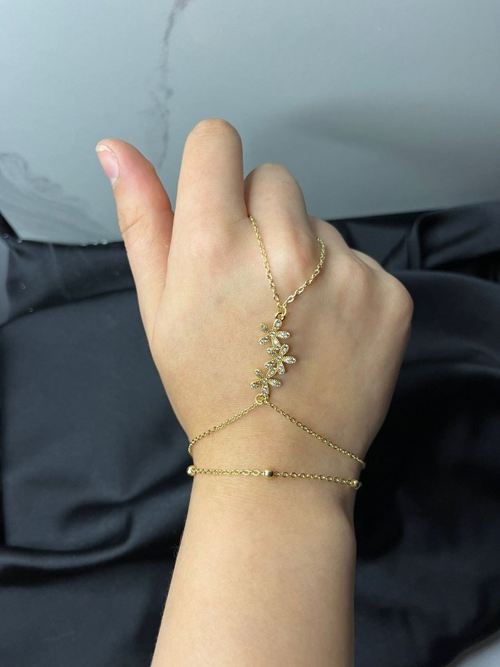 Altın renkli, zincir detaylı ve çiçek motifli kadın el zinciri, bohem ve retro tarzlar için uygun.