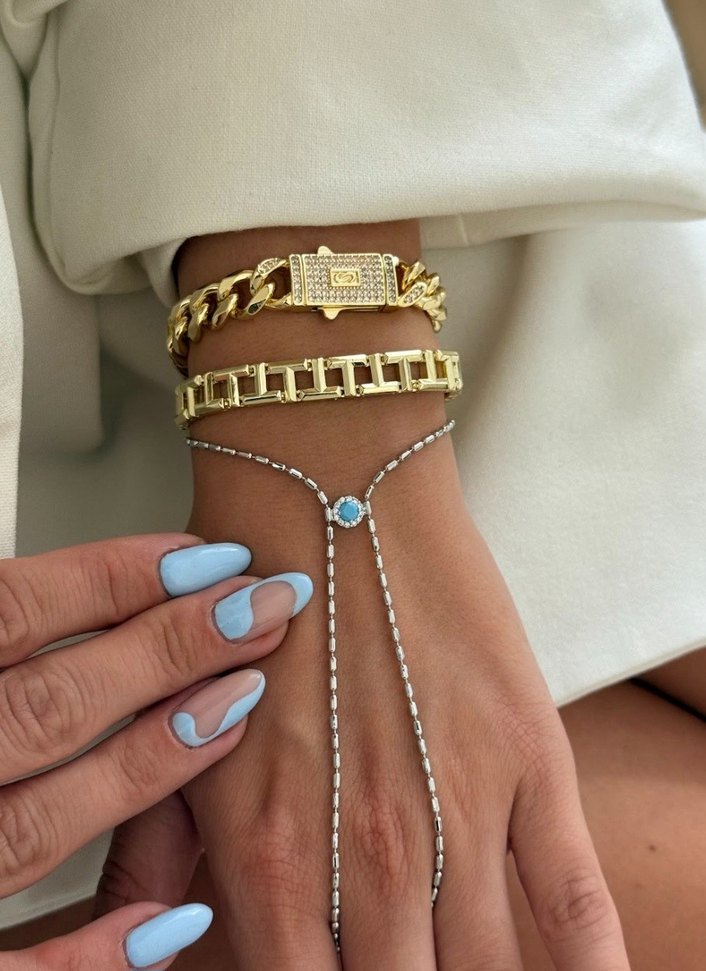 Günlük kullanıma uygun, zincir detaylı, altın renkli kadın el zinciri. Bohem ve göz alıcı tarzda.