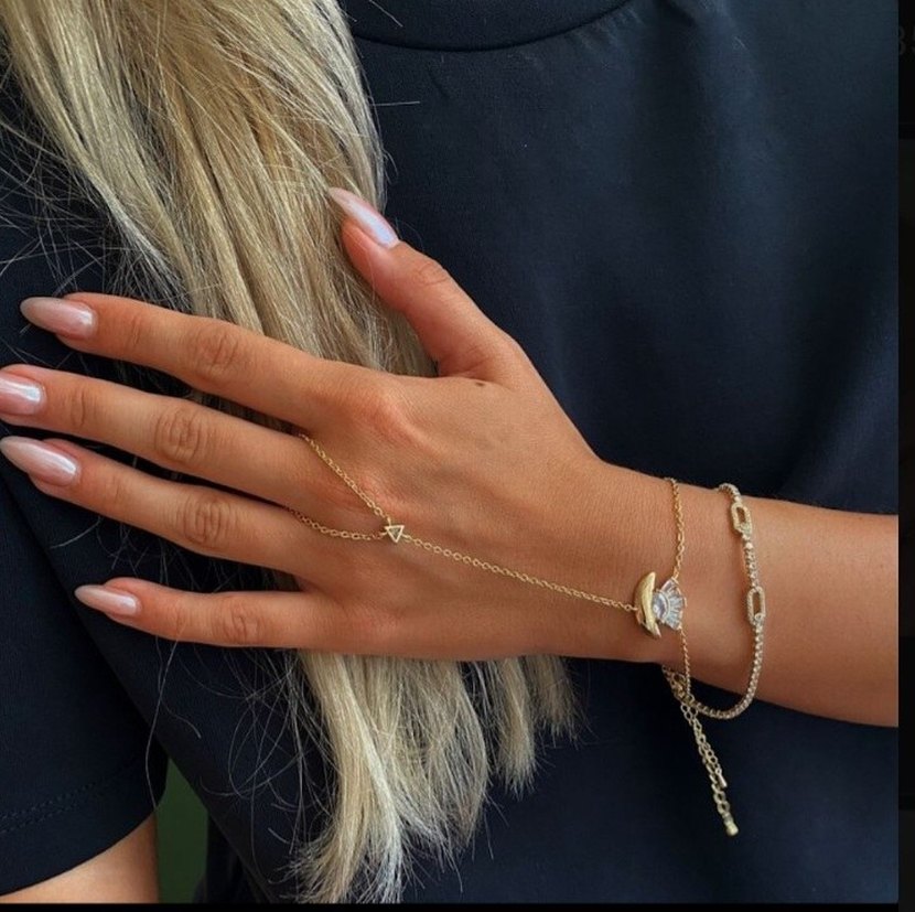 Altın renkli, zincir detaylı ve yılan desenli kadın el zinciri, günlük kullanıma uygun trendy ve bohem tarzda. ✨