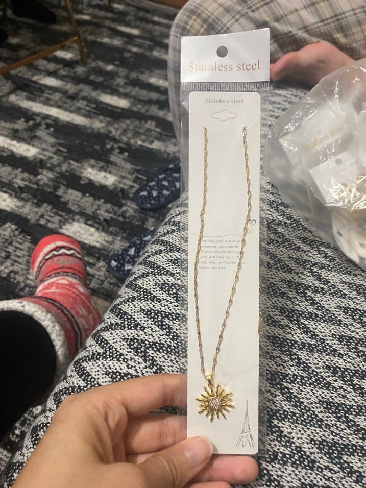 Altın renkli, zincir detaylı ve güneş figürlü paslanmaz çelik kolye. Midi uzunlukta, günlük kullanıma uygun bohem tarzda. ☀️