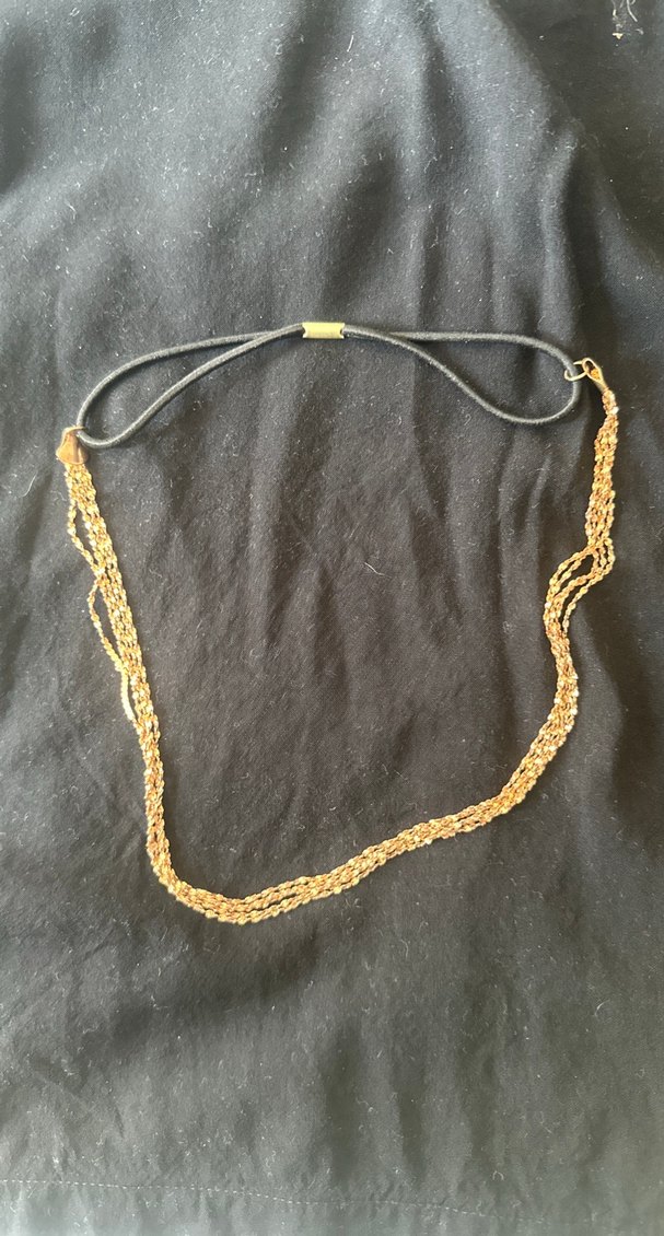 Parlak görünümlü, detaylı zincir tasarımlı altın renkli kadın vücut zinciri, ayarlanabilir siyah kayışlı. Günlük bohem tarz için uygun. ✨
