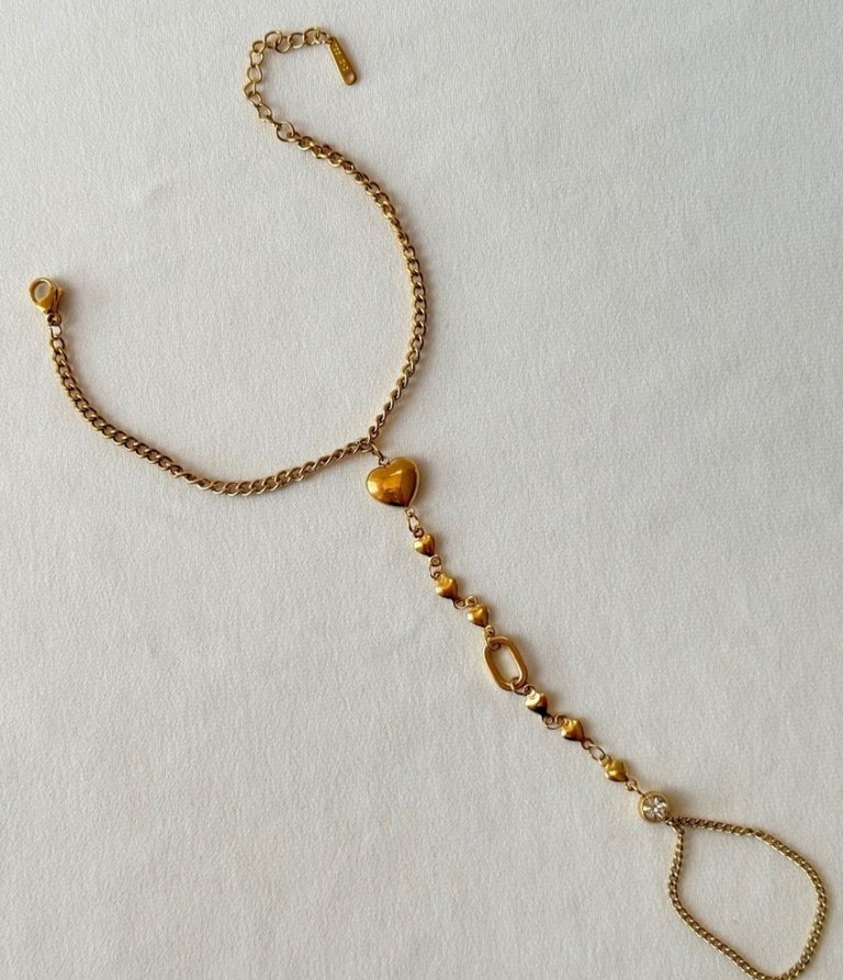 Parlak altın renkli zincir detayları ve kalp figürü olan bohem tarzda kadın el zinciri. Minimalist yılan deri deseni, günlük kullanıma uygundur.