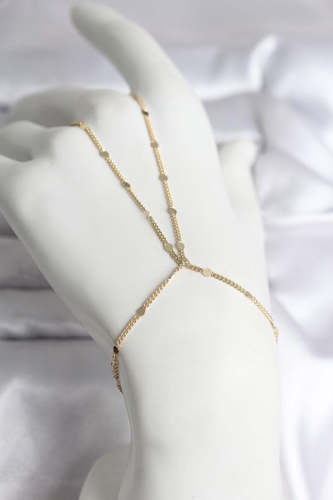 Zincir detaylı, yılan desenli, altın renkli kadın el zinciri, günlük kullanıma uygun çağdaş tarzda. Şahmeran
