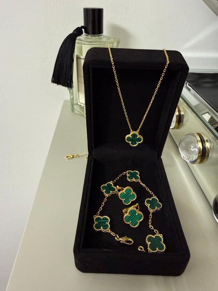 Altın renkli zincir detaylı, işlemeli koyu yeşil yonca desenli kadın takı seti, klasik zarafet ve bohem tarzı bir araya getirir. A kalitedir birebir kararma asla yapmaz