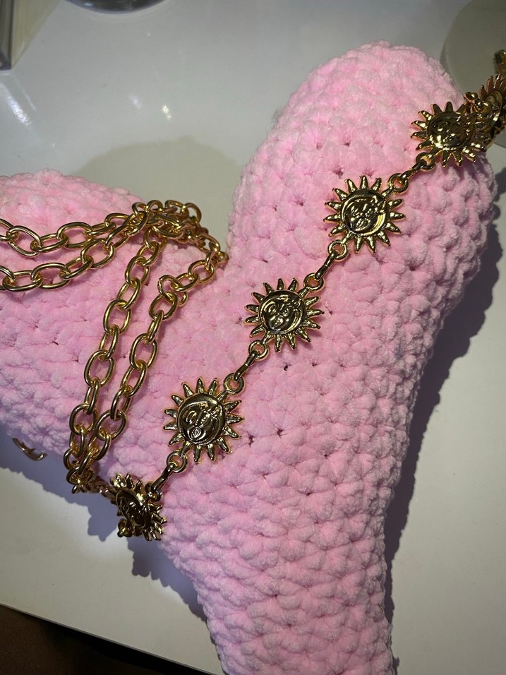 Altın renkli, güneş figürlü detaylara sahip zincir tasarımlı bohem tarzda kadın vücut zinciri.
