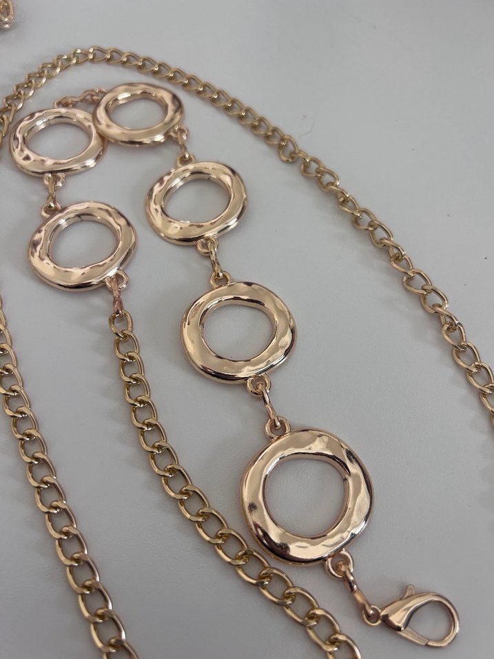 Altın renkli, parlak ve detaylı yuvarlak halkalara sahip bu kadın vücut zinciri, günlük kullanıma uygun göz alıcı ve çağdaş bir görünüme sahiptir. ✨