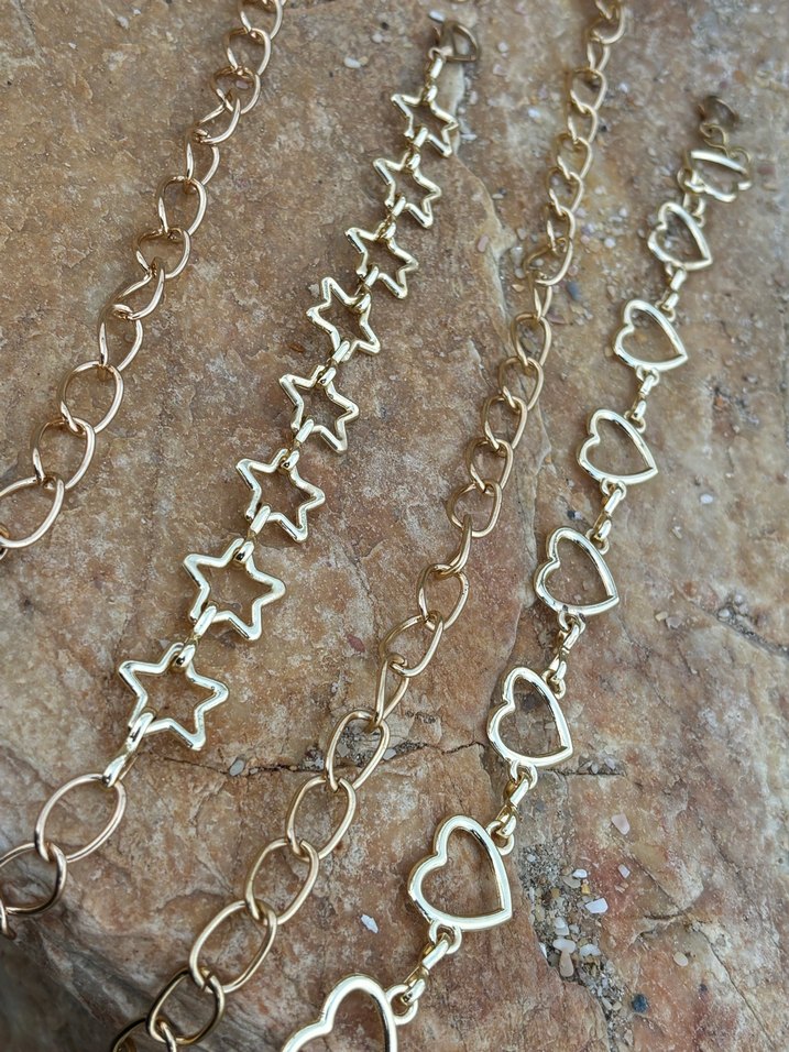 Parlak altın renkli, yıldız ve kalp detaylı zincirler, bohem tarzı ve açık hava kullanımı için uygundur. ✨