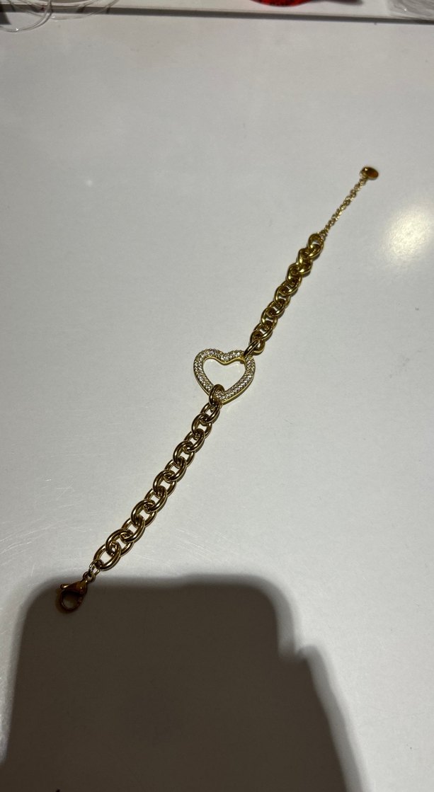 Parlak altın renkli zincir detaylı, kalp figürlü bileklik. Minimalist ve sokak tarzına uygun.