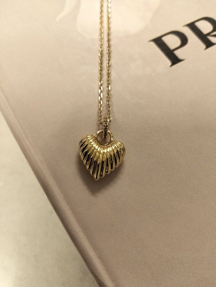 Altın renkli, zincir detaylı ve parlak kalp kolye, romantik buluşmalar için modern klasik tarzda tasarlanmıştır. Üzerinde baskılı desen vardır.