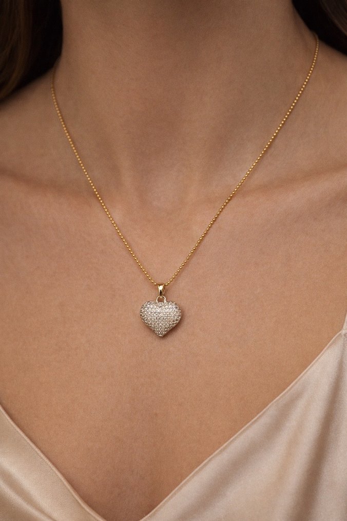Altın renkli, zincir detaylı ve taşlarla süslenmiş kalp şeklinde kolye. Midi uzunlukta, minimal ve klasik şıklığa uygun.