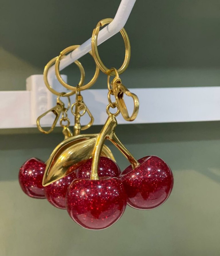 Parlak kırmızı kiraz figürleri ve zincir detaylı altın renkli anahtarlık, iddialı ve gösterişli tarz için uygun.