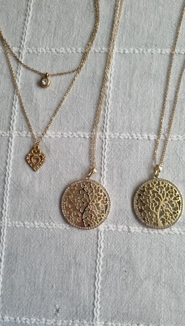 Günlük kullanıma uygun, zincir detaylı ve nakış desenli altın renkli kolyeler, midi uzunlukta.