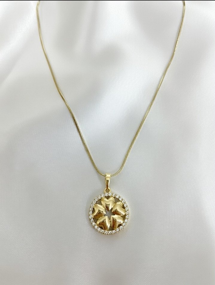 Altın renkli, zincir detaylı kolye. Çiçek desenli yuvarlak kolye ucu küçük taşlarla çevrili. Midi uzunluk, günlük kullanım için uygun minimal ve çağdaş tarzda.