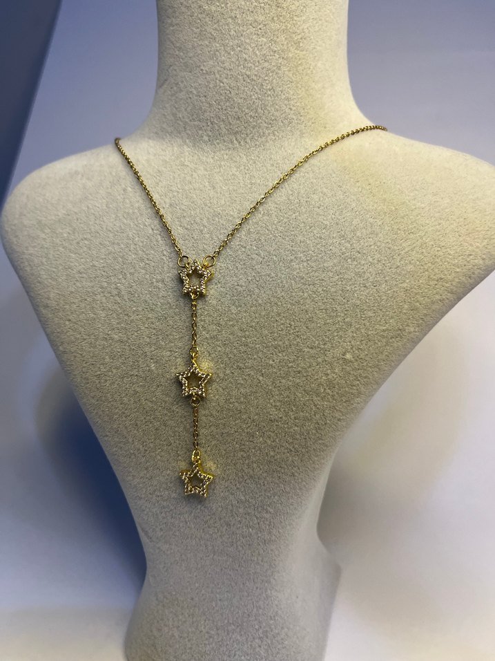Altın renkli, zincir detaylı ve işlemeli üç yıldız figürlü kolye. Parlak yüzeye sahip, midi uzunluğunda, günlük kullanıma uygun minimal ve bohem tarzda. ✨