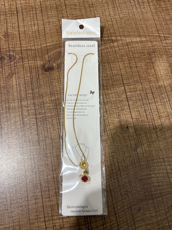 Altın renkli, zincir detaylı ve renkli baskılı ucu olan midi uzunlukta paslanmaz çelik kolye. Minimalist ve bohem tarzda, günlük kullanıma uygundur.