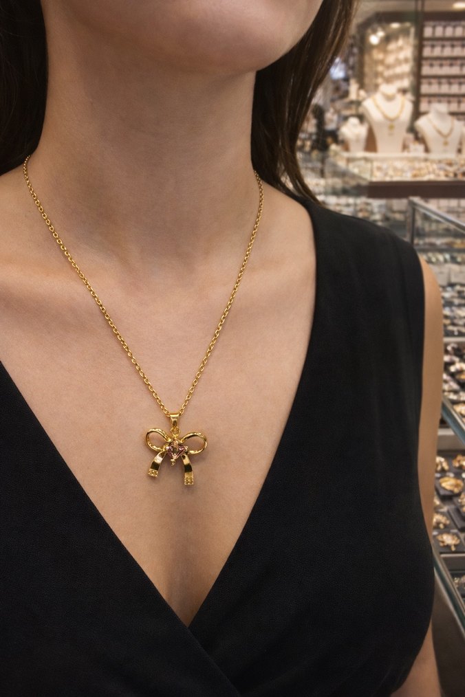 Altın renkli zincir detaylı, parlak yüzeyli ve fiyonk şeklinde kolye. Romantik akşamlar için klasik ve gotik tarzda.