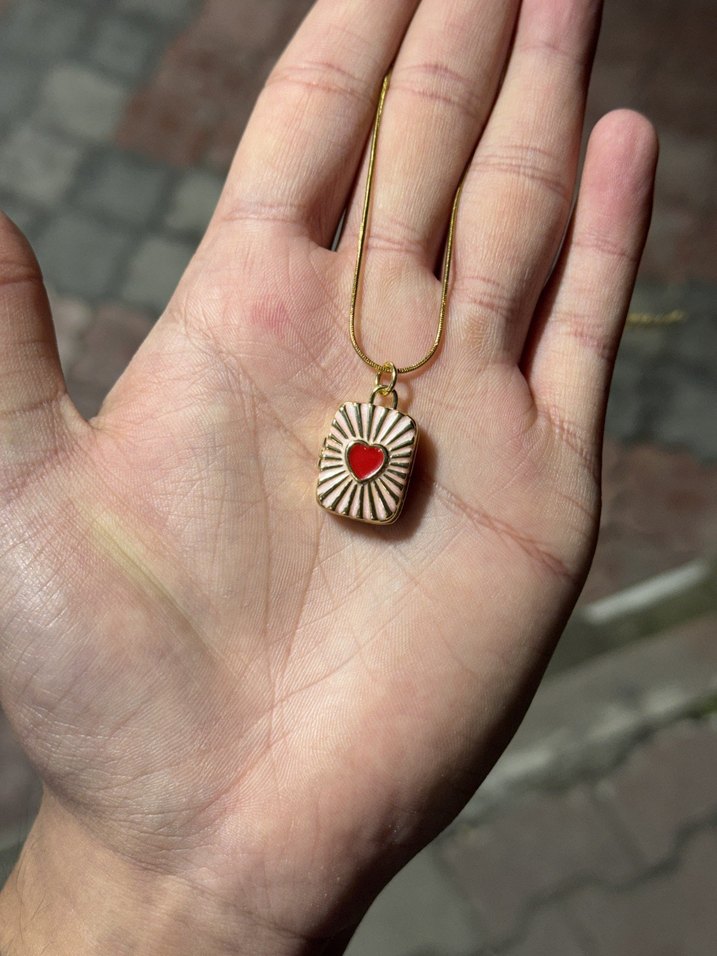 Altın renkli zincir detaylı, kırmızı kalp ve güneş deseni olan dikdörtgen kolye, bohem tarzda günlük kullanım için uygun.